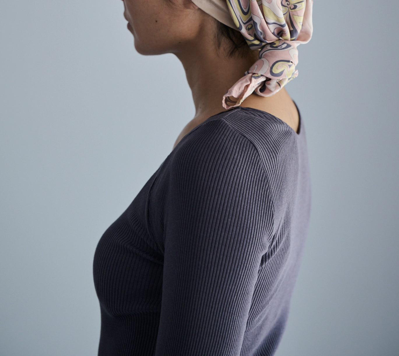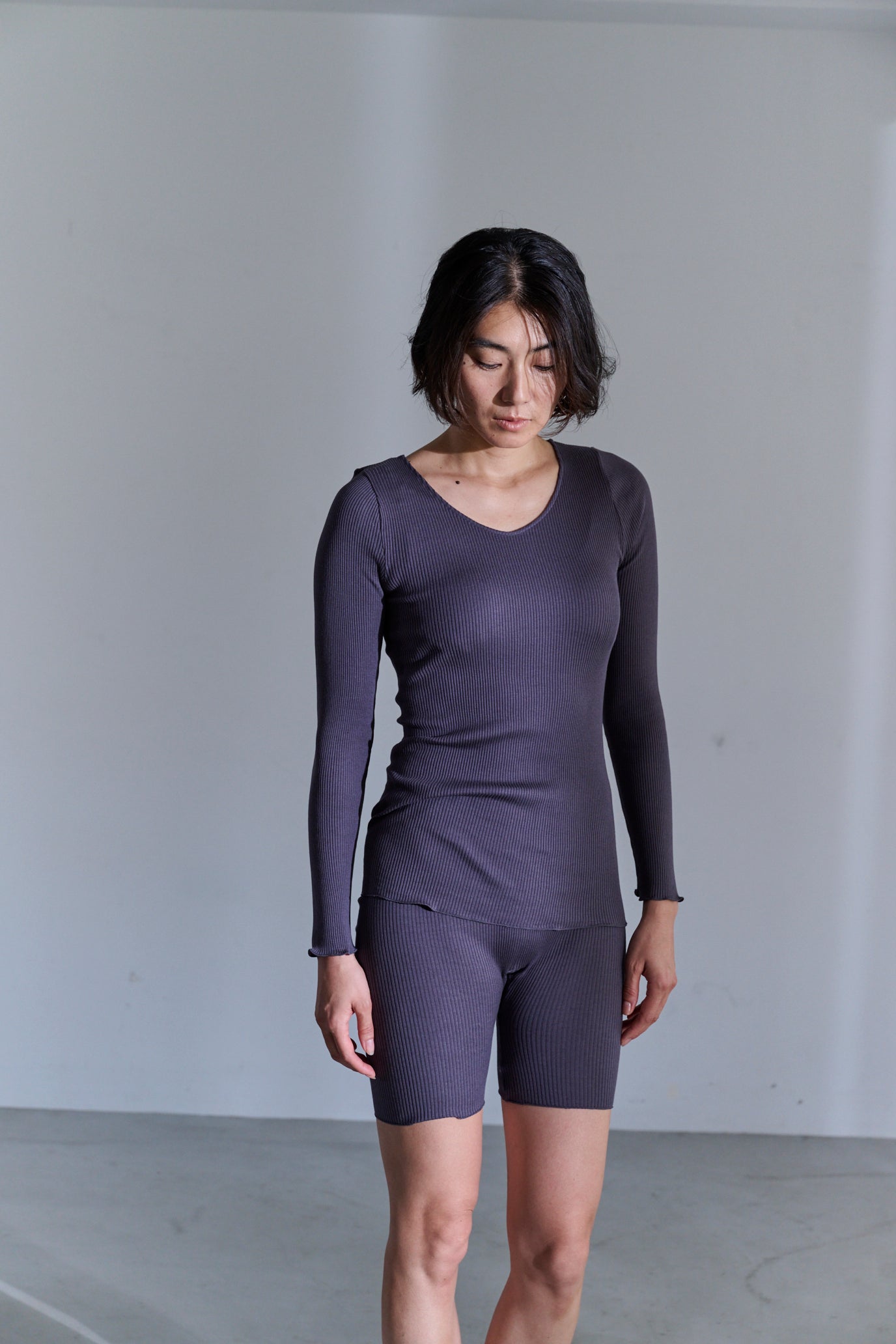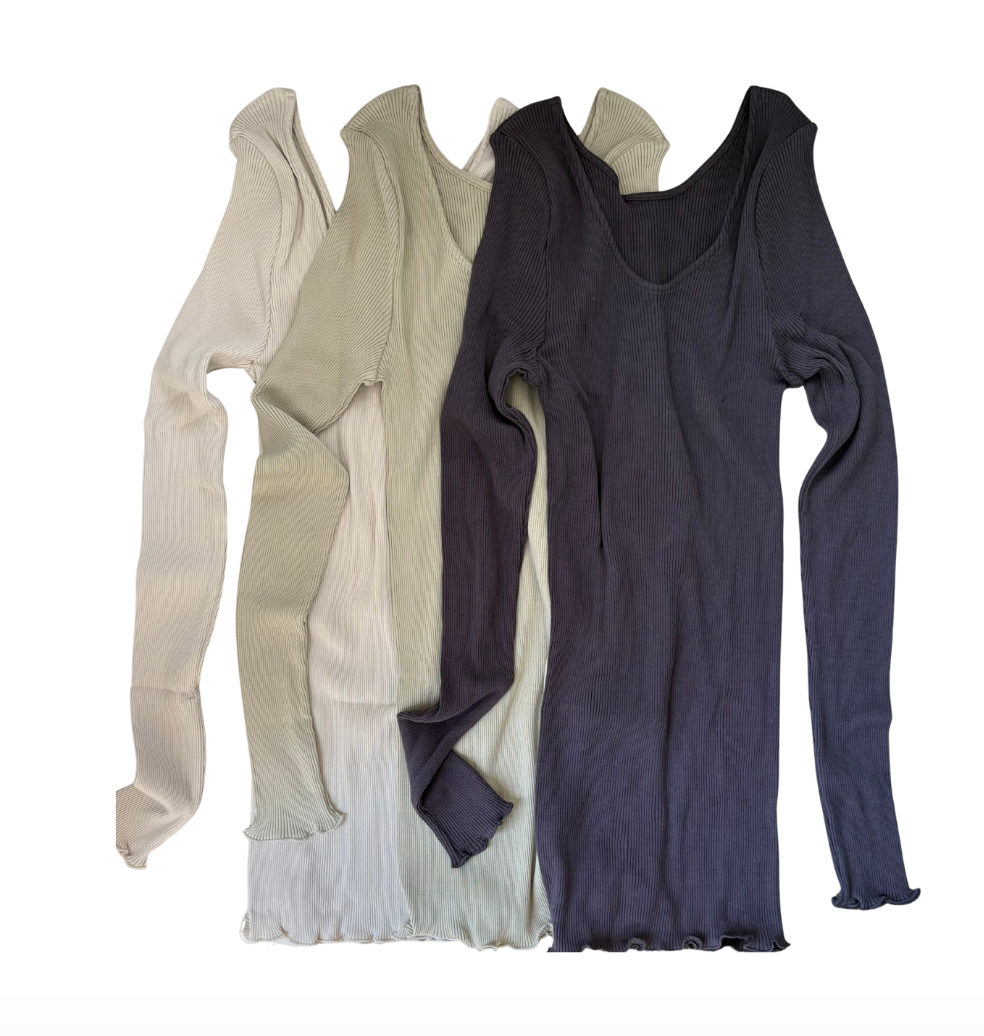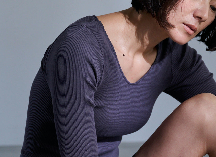 しっとりふわふわシルクコットンリブ肌着 長袖 (ロング丈、襟あき浅め)